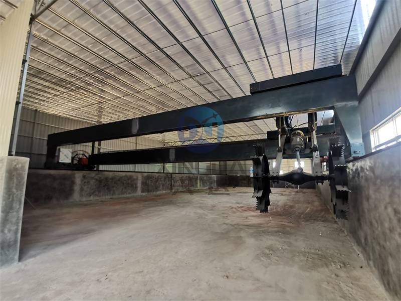 、偈紫葐臃言O(shè)備,啟動卷揚機,將翻拋滾筒緩慢放至發(fā)酵槽底部。根據(jù)地平的狀況,如果同條地平水平整體誤差在15毫米以下的,可以將翻拋機的葉片控制在離地30毫米左右。發(fā)酵槽地平達(dá)不到這一水平的,翻拋開葉片離地只能控制在50毫米左右。調(diào)節(jié)好翻拋機滾筒離地位置后,再將設(shè)備調(diào)至工作行走速度進(jìn)行翻堆。翻堆過程中要注意觀察,發(fā)現(xiàn)葉片打地時要及時將翻拋機的滾筒抬起,以免損壞設(shè)備。